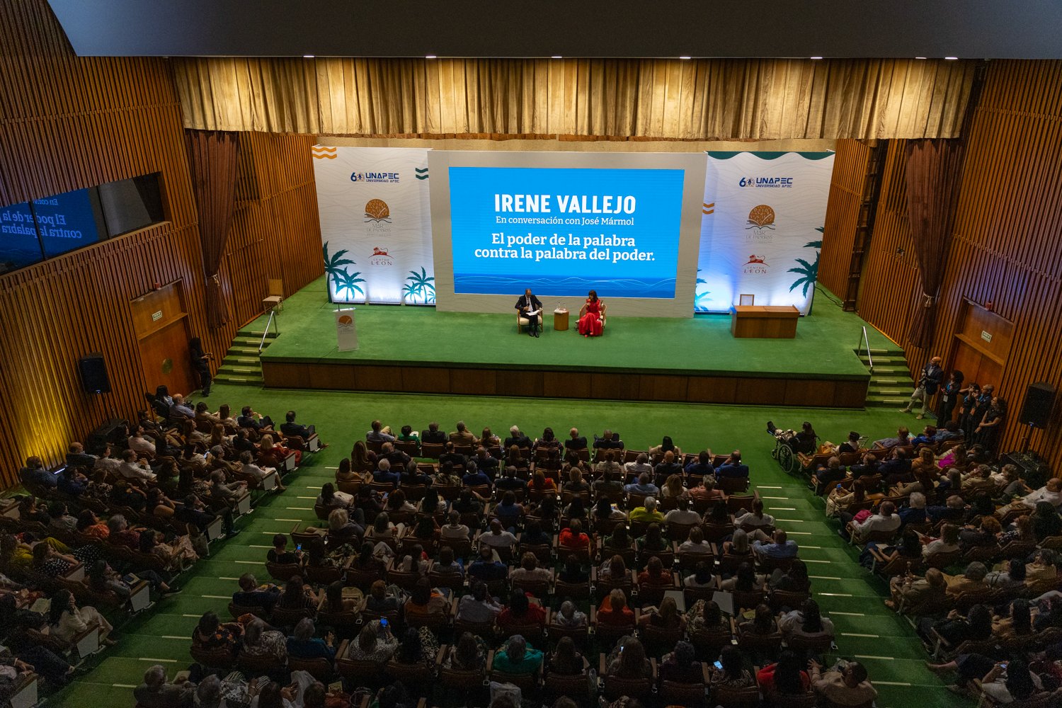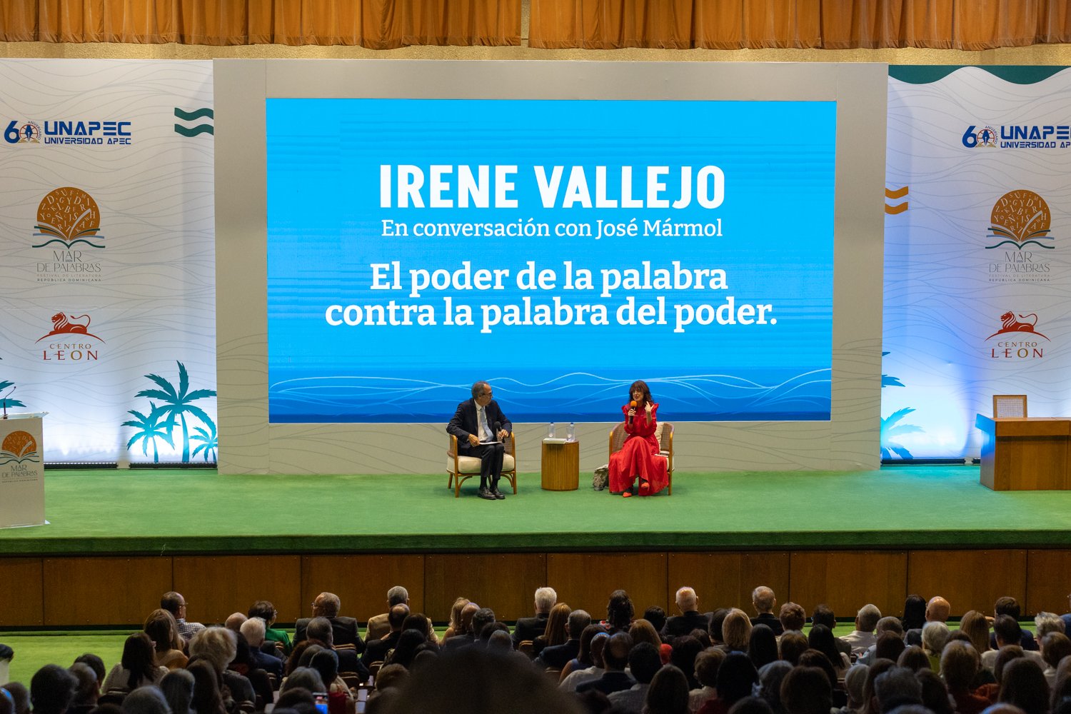 Santo Domingo, R.D. – La escritora española Irene Vallejo y el poeta dominicano José Mármol protagonizaron el conversatorio “El poder de la palabra contra la palabra del poder”, realizado en el Auditorio del Banco Central como parte del Festival Mar de Palabras y en el marco de la entrega del Doctorado Honoris Causa a Vallejo por la Universidad APEC (UNAPEC).