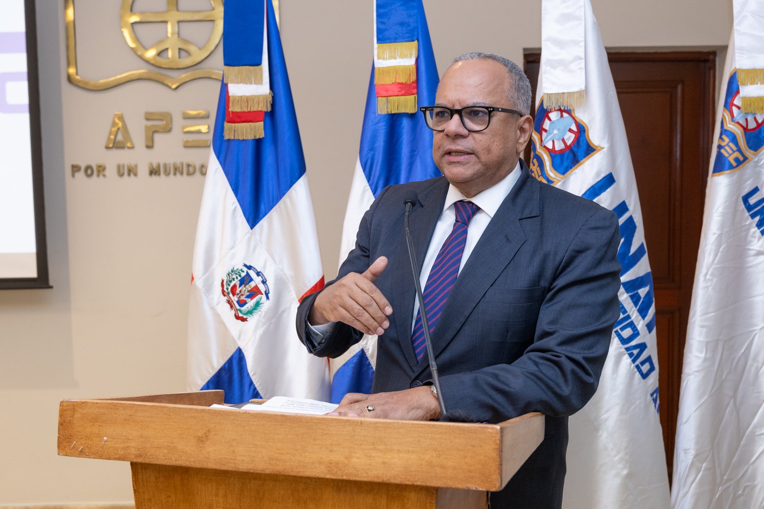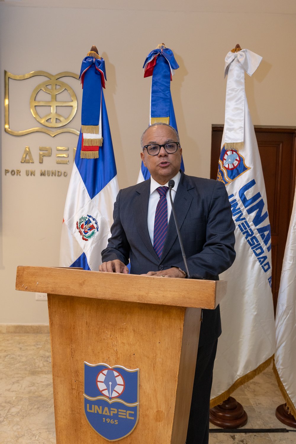 Durante el acto, el rector de UNAPEC, Lic. Erik Pérez Vega, pronunció las palabras centrales de apertura, destacando que la universidad es el espacio natural para la reflexión profunda sobre los principios que sostienen la República, la Constitución, el Estado de Derecho y la responsabilidad ciudadana de preservarlos.