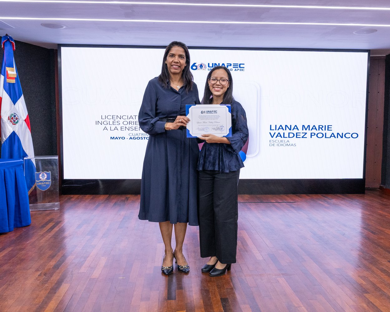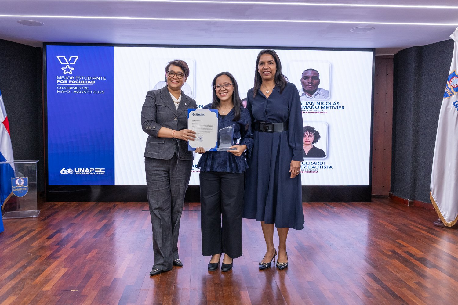 La estudiante Sara Gerardi Valdez Bautista, de la Facultad de Ciencias e Ingeniería, fue reconocida como la Mejor Estudiante de UNAPEC durante el cuatrimestre mayo-agosto 2025, distinción que obtiene por tercer año consecutivo.