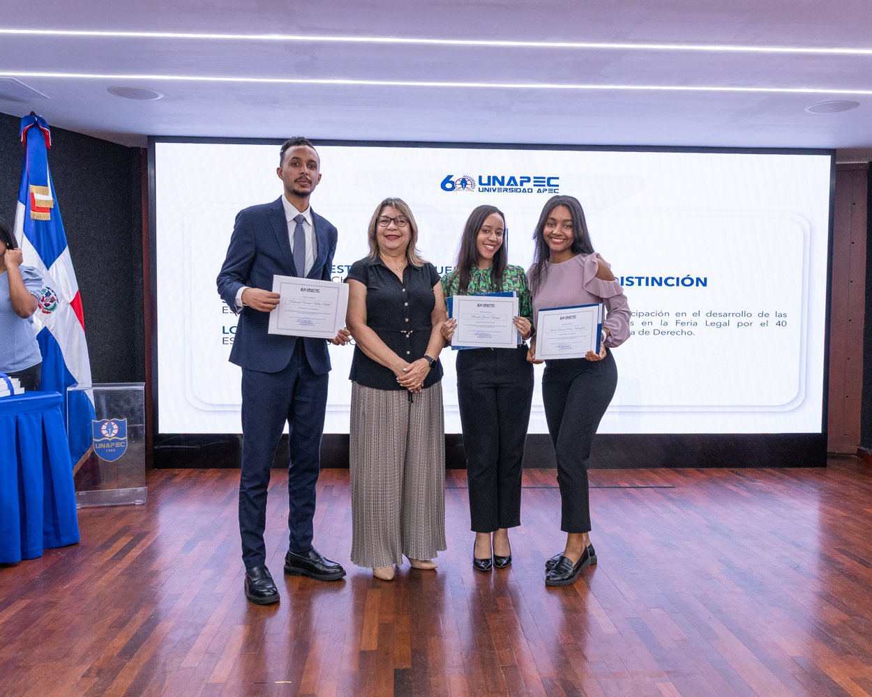 Por la Escuela de Derecho, la Licda. Rosa Luisa Fernández entregó reconocimientos a los alumnos Cristian Nicolás Caamaño Metivier, Rolando Ernesto Valdez Puello, Sara Yamilette Espinosa Andeliz y Loida Eunice Pérez Valenzuela, por su destacada participación en la Feria Legal del 40.º Aniversario de la escuela.