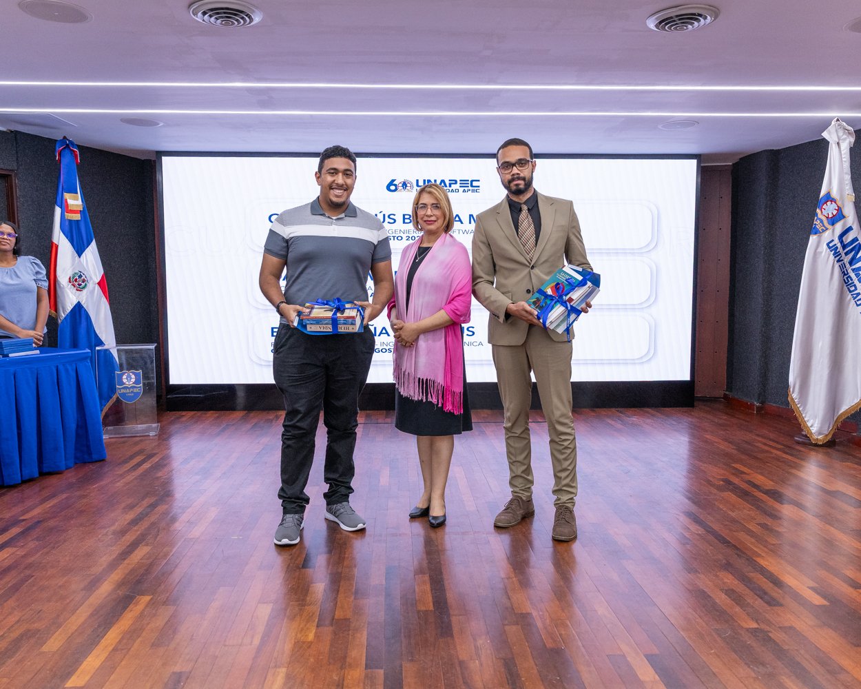 La Licda. Amarilis Beltré, directora de la Biblioteca UNAPEC, premió a los estudiantes Carlos Jesús Bobea Mejía, Daniel Ahmad Belliard y Ezeul Ureña de Jesús por ser los usuarios más activos en el uso de los recursos bibliográficos.